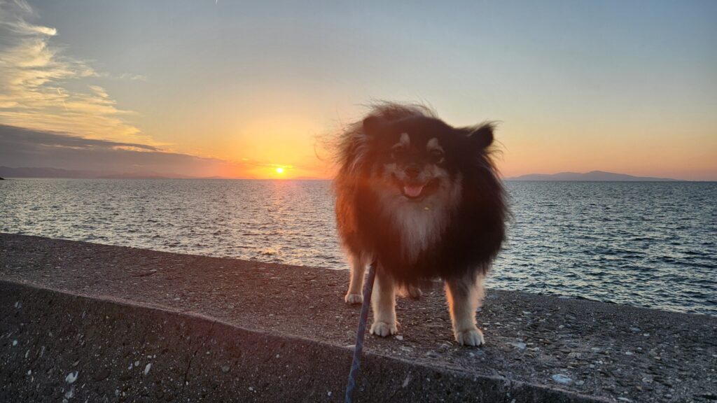 きれいな夕日と愛犬【いち】の笑顔に癒された瞬間です。